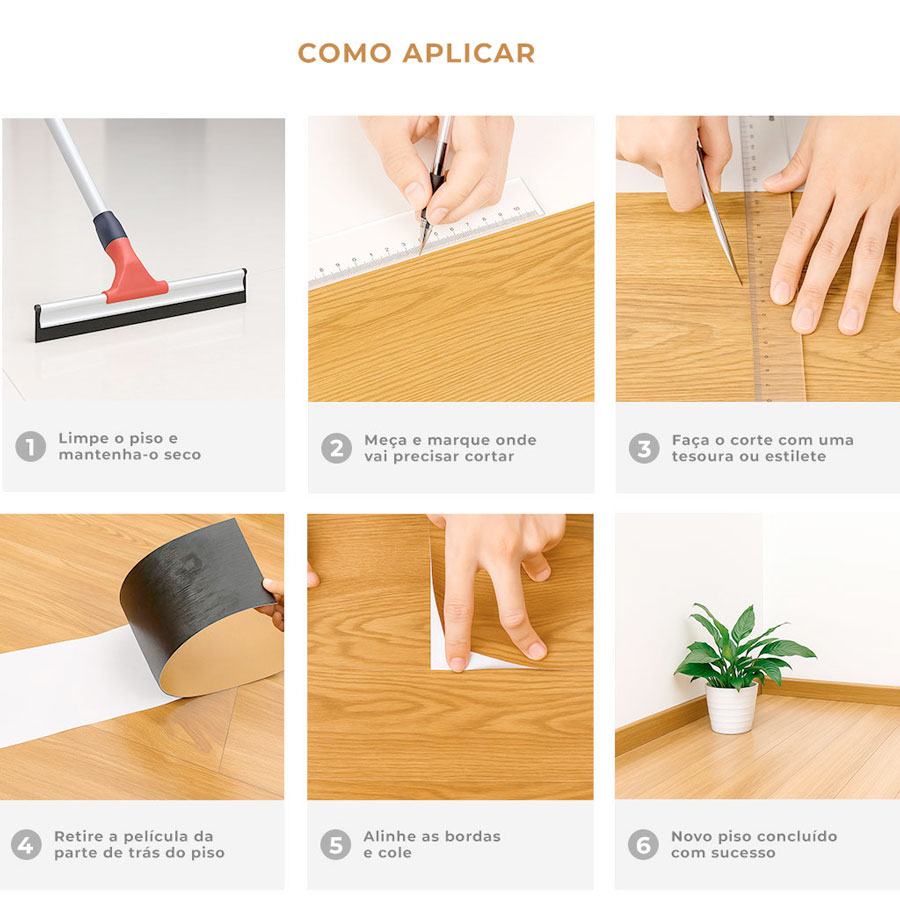 Não precisa de colaautocolanteSemi-brilhoefeito porcelanatoCom texturarealistaPeças em réguade 15x91Piso sobre pisopode aplicar sobre cerâmicaMédio tráfegorecomendadoAcabamento fácilcom tesouraFácil aplicaçãofaça você mesmoInove sem sujeirae sem poeiraSem desperdíciona quantidade certaPode limparágua e sabão neutroCusto únicosem argamassa e rejunte